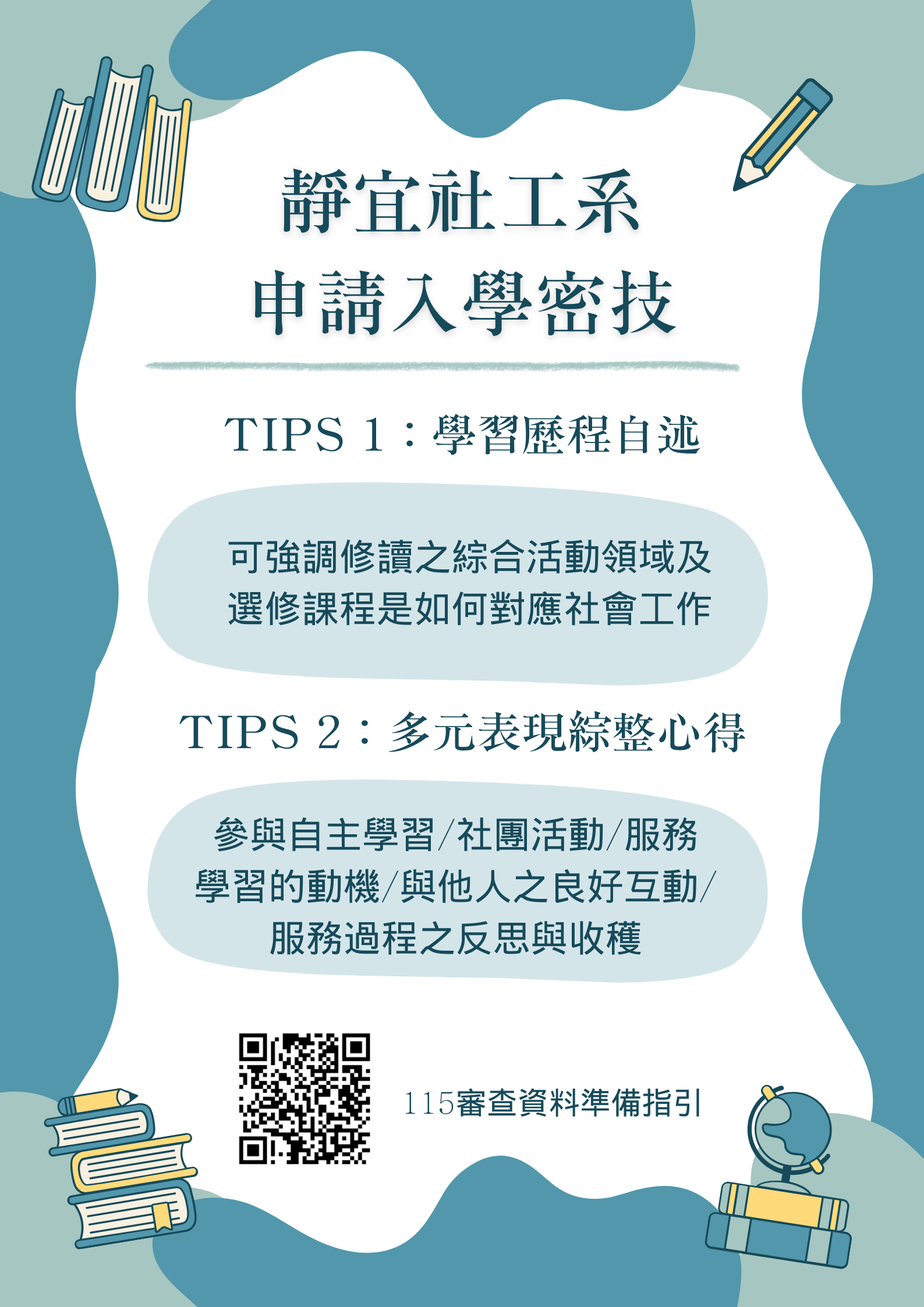 因本系屬社會心理學群,「學習歷程自述」中可強調同學修讀之「綜合活動領域」及「選修」課程是如何對應「社會工作」領域專長。